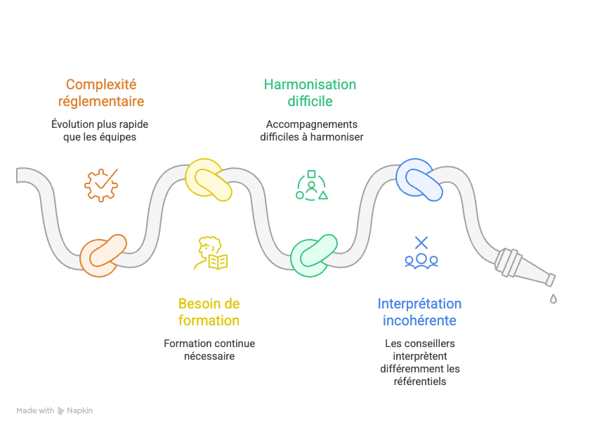 - une perte d’efficacité lorsque chaque conseiller interprète différemment les référentiels.