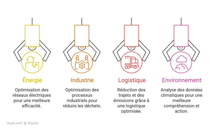 L’IA peut également contribuer à l’optimisation des infrastructures. Dans les systèmes énergétiques, par exemple, elle est utilisée pour améliorer la gestion des réseaux électriques, anticiper les variations de production des énergies renouvelables ou optimiser la consommation énergétique des bâtiments. Dans la logistique et l’industrie, elle permet de réduire les trajets inutiles, d’optimiser l’utilisation des ressources et d’améliorer l’efficacité des processus.