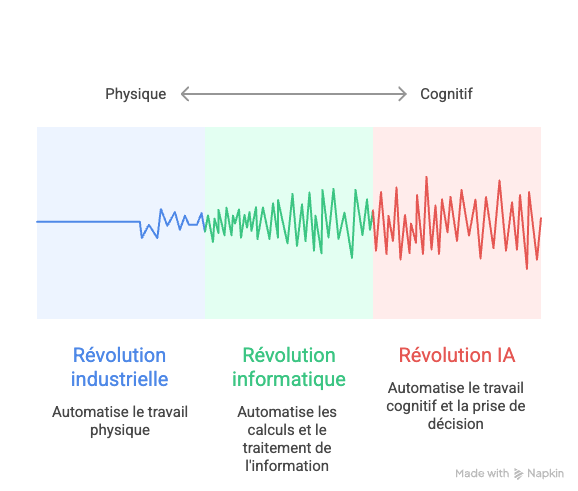 Les révolutions industrielles précédentes ont d’abord automatisé l’énergie physique et la production matérielle. Les machines ont remplacé ou amplifié la force humaine dans les usines, les transports ou l’agriculture. L’IA, au contraire, intervient dans des domaines longtemps considérés comme relevant exclusivement de l’intelligence humaine : analyse de données, rédaction de textes, programmation, traitement d’informations complexes ou production de contenus.
