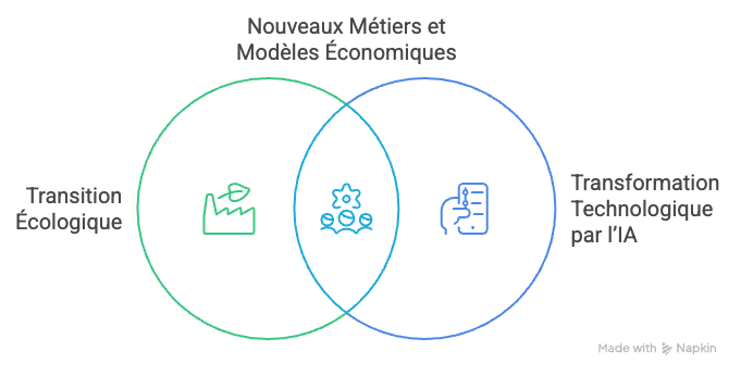 La diffusion de l’intelligence artificielle intervient donc dans un moment particulier : celui d’une transformation simultanée des systèmes économiques liée à la transition climatique. Autrement dit, les sociétés doivent gérer deux transitions majeures en parallèle : une transition écologique qui transforme les modes de production et une transition technologique qui modifie la structure du travail.
