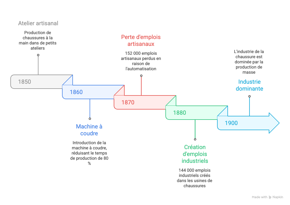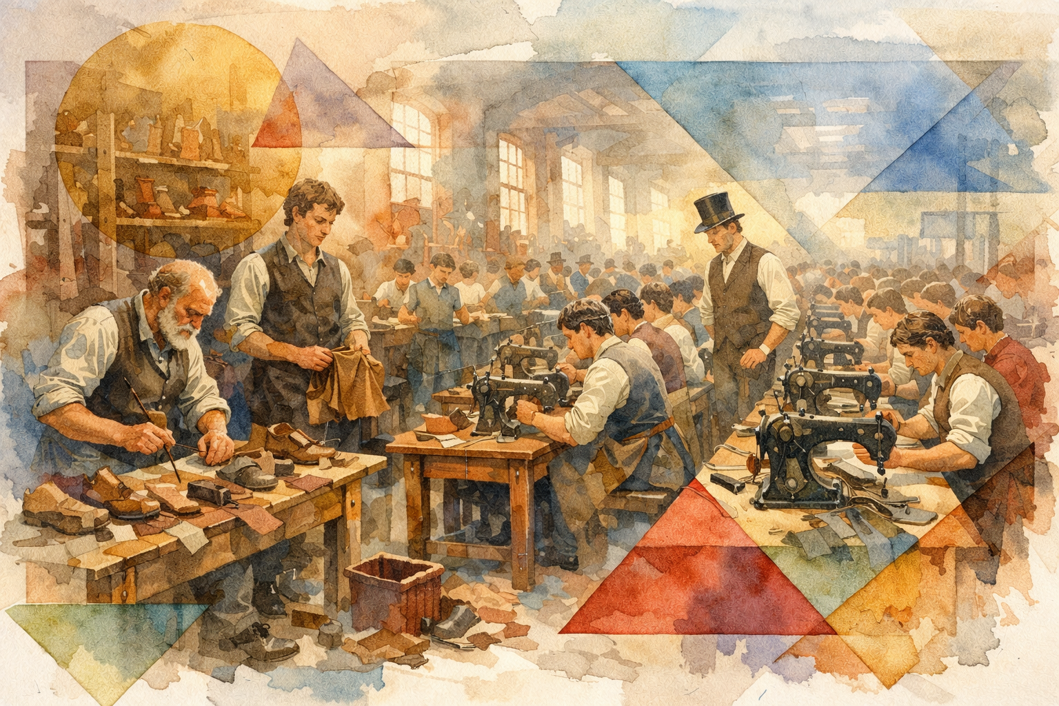 Au XIXᵉ siècle, l’introduction des machines à coudre dans l’industrie de la chaussure transforme profondément l’organisation du travail : la production artisanale laisse progressivement place à la fabrication industrielle de masse. Cette transition illustre la manière dont les innovations technologiques reconfigurent les métiers et les systèmes économiques sur plusieurs générations.