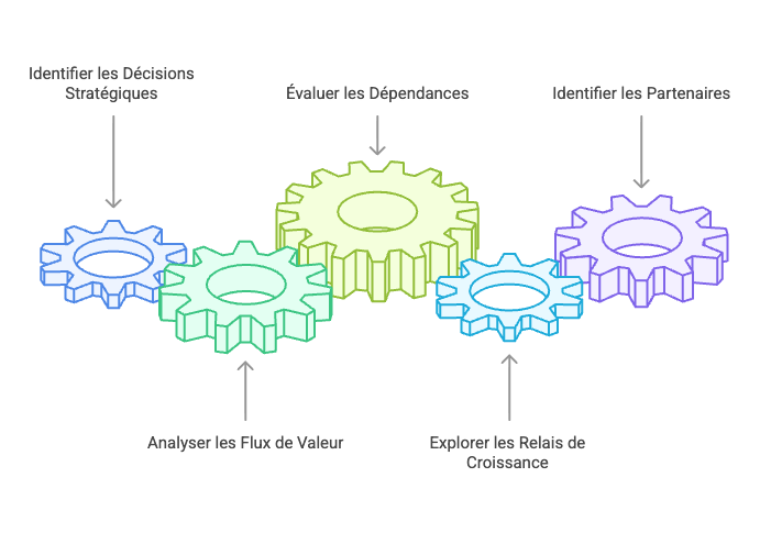 Qui dépend de qui ? Quels acteurs captent aujourd’hui la valeur ? Quelles alliances peuvent modifier le jeu concurrentiel ? Quels segments sont en train de se structurer ? Où se trouvent les nœuds critiques de la chaîne de valeur ? Quels partenaires pourraient accélérer l’accès au marché, à la technologie ou au financement ?
