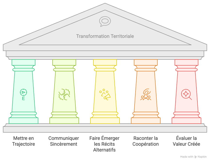 Mettre en trajectoire, communiquer sincèrement, faire émerger des récits alternatifs, raconter la coopération, évaluer la valeur créée : ces cinq dimensions forment un ensemble cohérent.